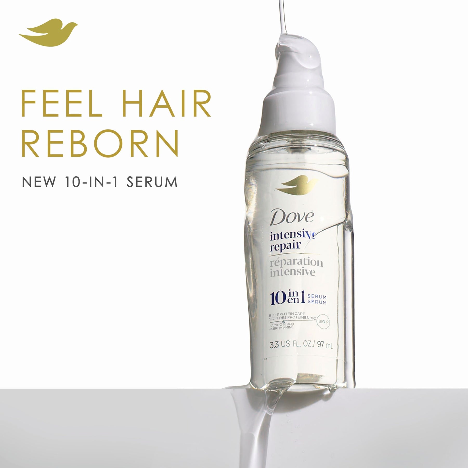 Details: Feel fearless. Feel reborn. Feel free to live beautifully, every day, no matter how you style your hair. Now every time you color, bleach, straighten or blow-dry your hair, Dove Intensive Repair Advanced Damage Therapy 10-in-1 Serum Oil will transform it—re-shielding and protecting it from future hair breakage. Enriched with Amino Serum, a key amino acid found in hair, this hair serum for damaged hair nourishes and reduces hair protein loss. So, there’s no need to stress. You can feel good about your new look and new you. Our Intensive Repair range with Bio-Protein Care technology is designed to regenerate hair strength and refill it with 1 trillion strength protein builders with every wash. Dove Serum Oil delivers 10 transformative benefits in just 1 minute: 1) 72H damage protection; 2) Restores hair barrier; 3) Reduces protein loss; 4) 7x stronger hair; 5) 90% less breakage; 6) 72H smoothness; 7) Helps prevent split ends; 8) Improves hair fluidity; 9) 48H enhanced gloss; 10) 450°F heat damage protection. vs. non-conditioning shampoo Dove Intensive Repair hair products are ideal for damaged hair that needs extra care. Just apply 1-3 pumps of Dove serum to damp or dry hair from mid-lengths to ends. For extra hair repair, use the Dove Intensive Repair hair mask for dry, damaged hair once a week generously after using the Dove Shampoo and hair conditioner. This is also the best hair serum for damaged hair and a great hair serum for shiny hair. As always, Dove hair products are vegan and PETA approved, meaning it’s not tested on animals globally. Discover hair freedom and free yourself from the worry of hair damage-embracing a new dawn of hair possibilities now. 4-step system, shampoo, conditioner/mask & serum