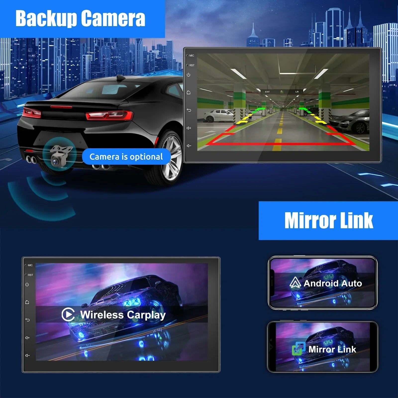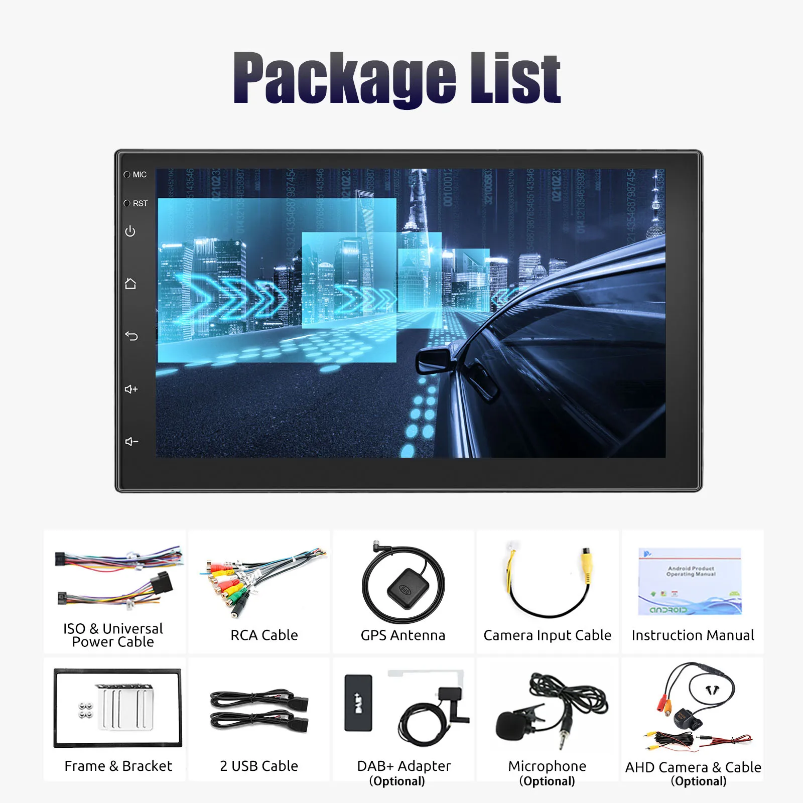 7 Inch 2 DIN Android Car Radio: The Android car radio with 7 inch capacitive touch screen, 4GB RAM and 64GB ROM provides enough space to download your favourite apps and videos, so driving won't be boring anymore. With two USB ports, it supports fast mobile phone charging. With the rear microphone input, you can add a microphone to make your voice clearer (not included).