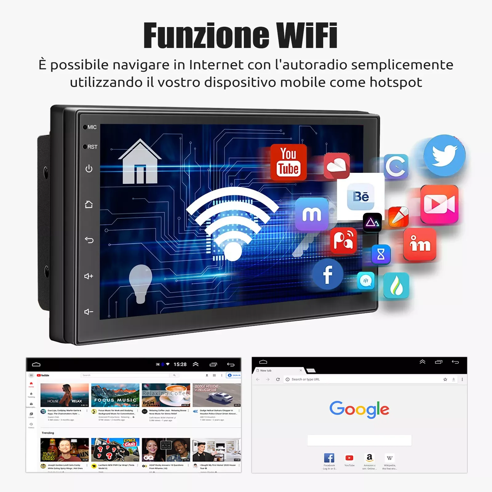 Mirror Link & Wireless Carplay & Android Auto: With this car radio, you will experience the impressive Mirror Link function, compatible with iOS and Android phones. You can mirror your smartphone screen to the car radio using apps like Google Maps, Spotify, Youtube, etc. Replace your mobile phone with the car screen and turn your vehicle into a smart platform. Immerse yourself in a seamless and user-friendly infotainment experience with Apple CarPlay & Android Auto. Connect your iPhone to Apple CarPlay or your Android smartphone to Android Auto and securely access calls, texts, navigation, music and more. With intuitive operation via the touchscreen or voice control, you have all functions at your fingertips while you remain safely at the wheel. Use your favorite apps and stay connected at all times while keeping your eyes on the road. Turn your vehicle into an extended hub for your mobile devices and experience a new dimension in infotainment.