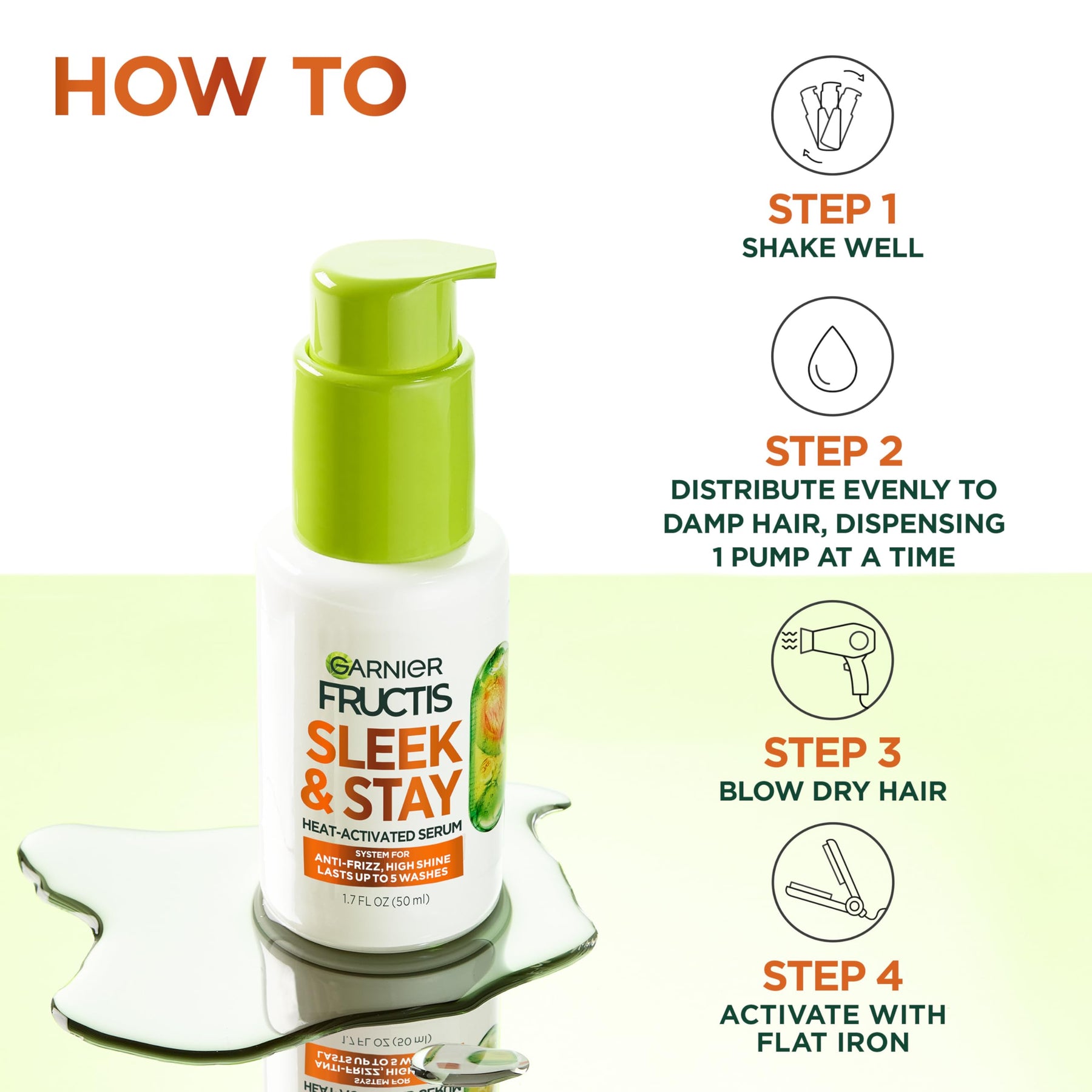 Details: Frizzy, dry hair? Sleek and Stay heat-activated leave-in serum gives you an ultra glassy sleek that lasts up to 5 washes with system of shampoo, conditioner, and sleek and stay. Provides heat protection up to 450F. Infused with alpha-silane for long-lasting sleek and formulated without parabens, phthalates, or DMDM Hydantoin. All Garnier products are approved by Cruelty Free International under the Leaping Bunny Program. Shake well before use. After using Sleek & Shine Shampoo & Conditioner, distribute evenly to damp hair, dispensing 1 pump at a time. Do not rinse. Blow dry your hair, then use a flat iron to thermo-lock long-lasting sleek.