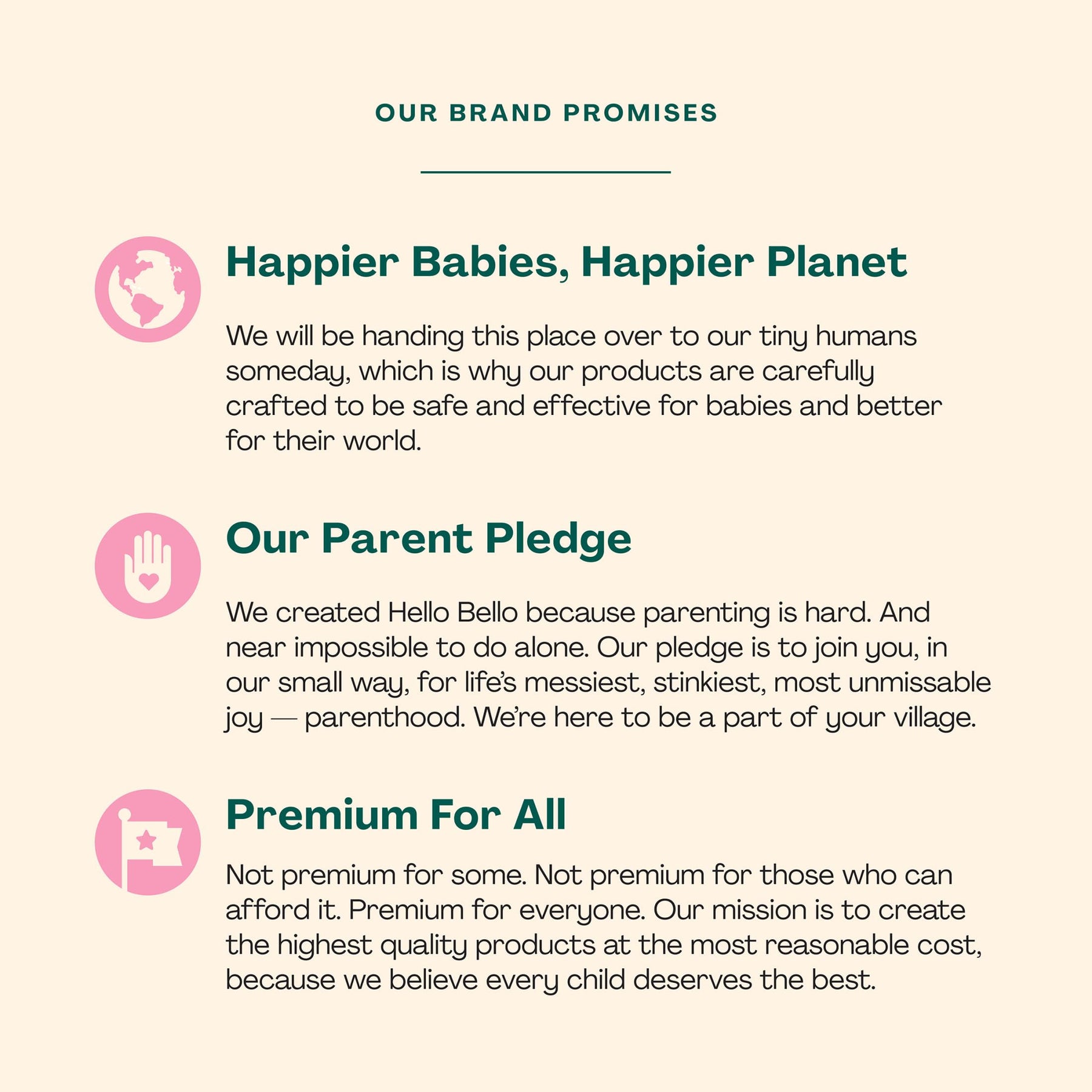 Details: PREMIUM FOR ALL. Not premium for some. Not premium for those who can afford it. Premium for everyone. Our mission is to create the highest quality products at the most reasonable cost, because we believe every child (and family) deserves the best. Hello Bello believes in giving back and has donated over 6 million diapers (and a heckuva lot of wipes and care products) to parents in need.
