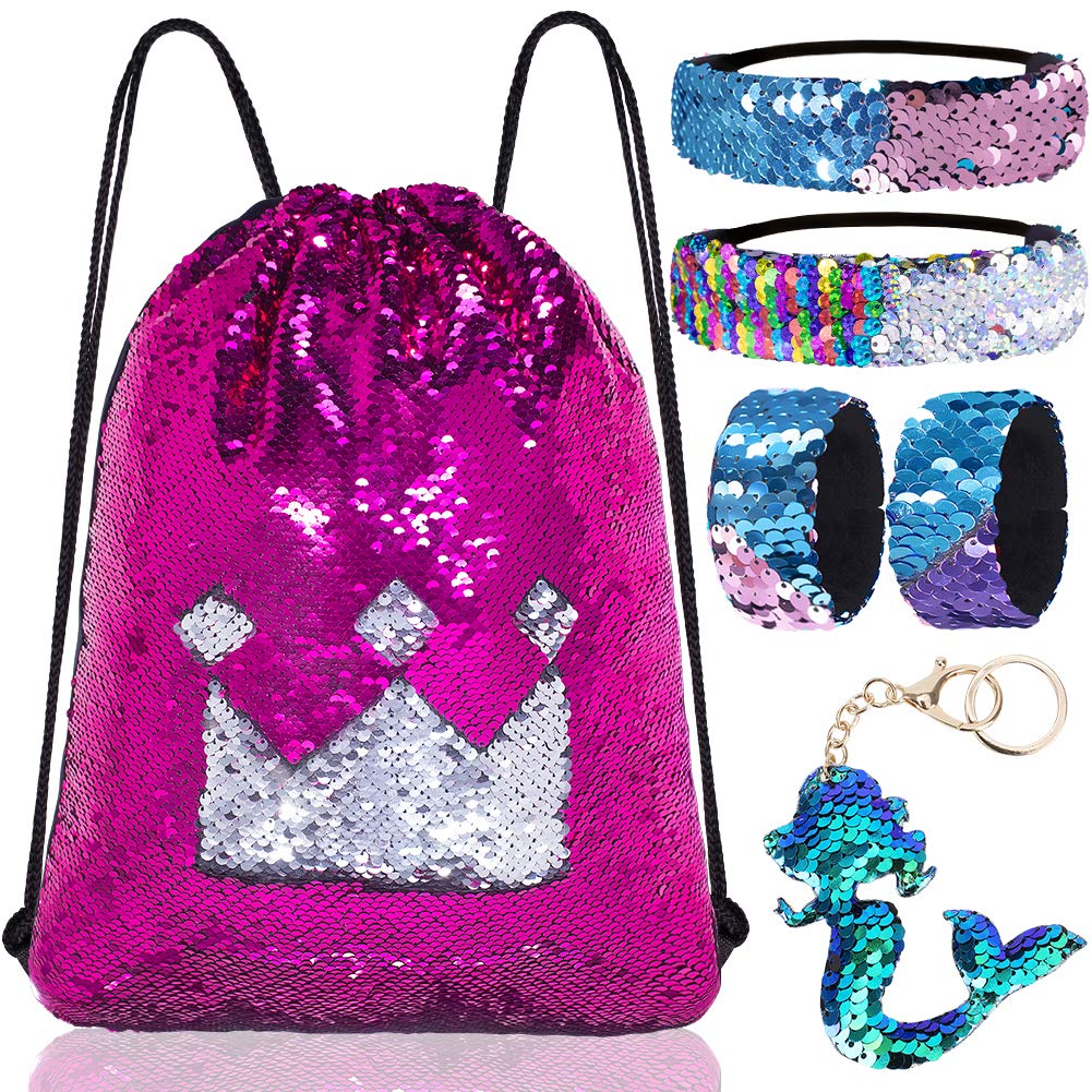 Mermaid Reversible Sequin Drawstring Backpack/Bag Rose Red/Silver for Kids Girls One_Size