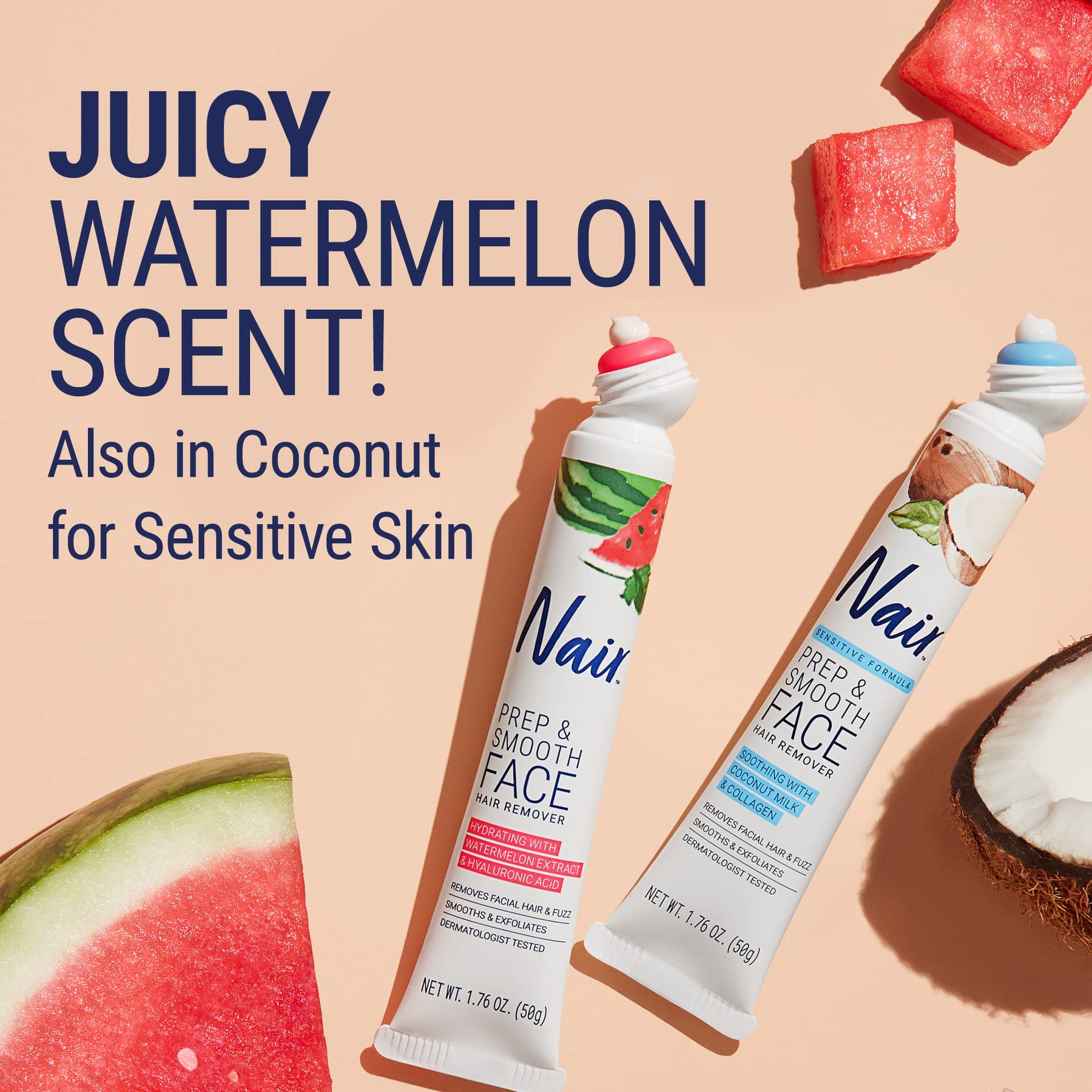 • Nair Prep & Smooth facial hair remover for women, infused with hydrating watermelon extract and hyaluronic acid
