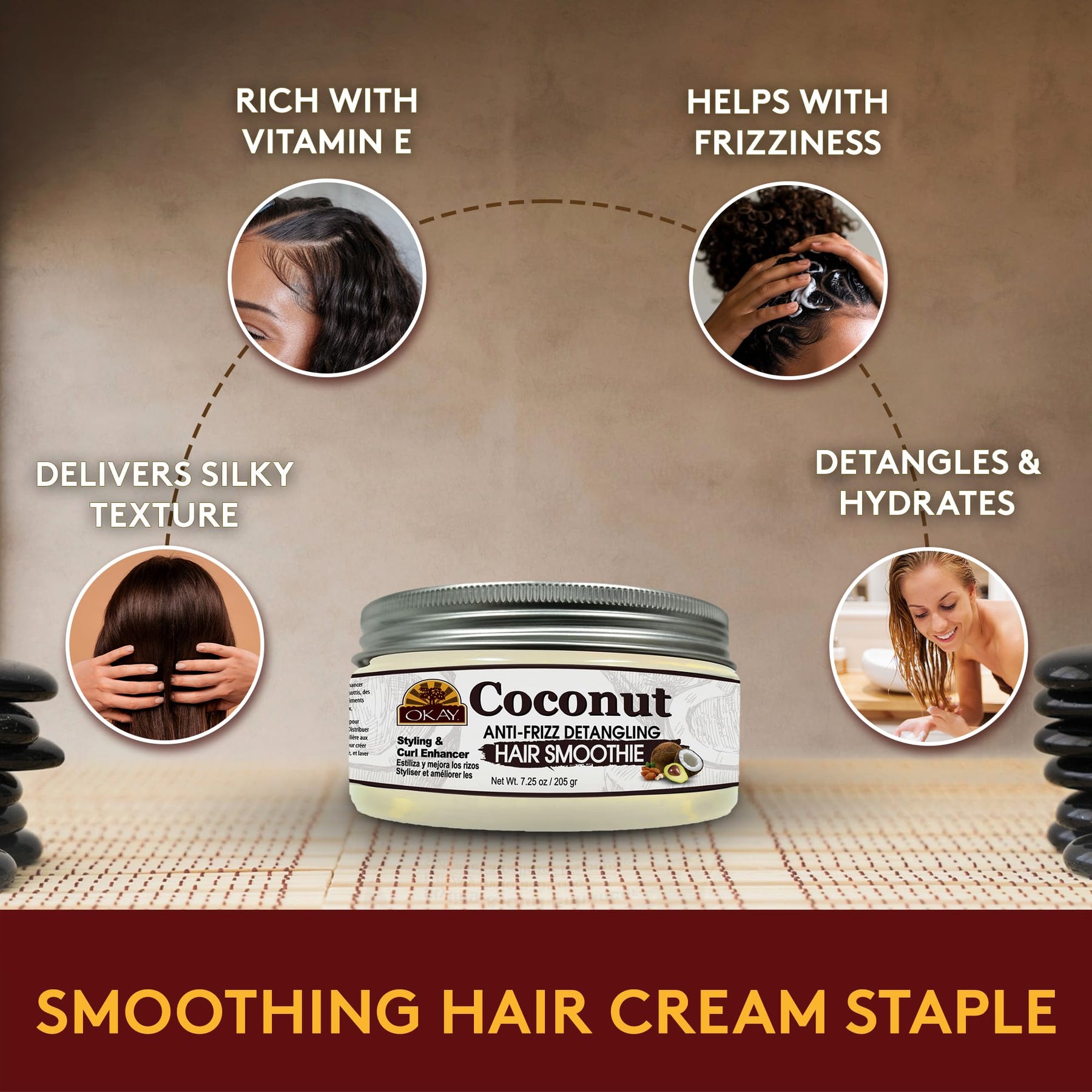 Details: Okay Coconut Anti-Frizz Detangling Hair Smoothie is a styling and curl enhancer that penetrates the hair shaft to infuse moisture for smooth, frizz free, well-defined curls. Our unique blend of Coconut oil replenishes nutrients that provide shine and luster leaving hair manageable and beautiful.