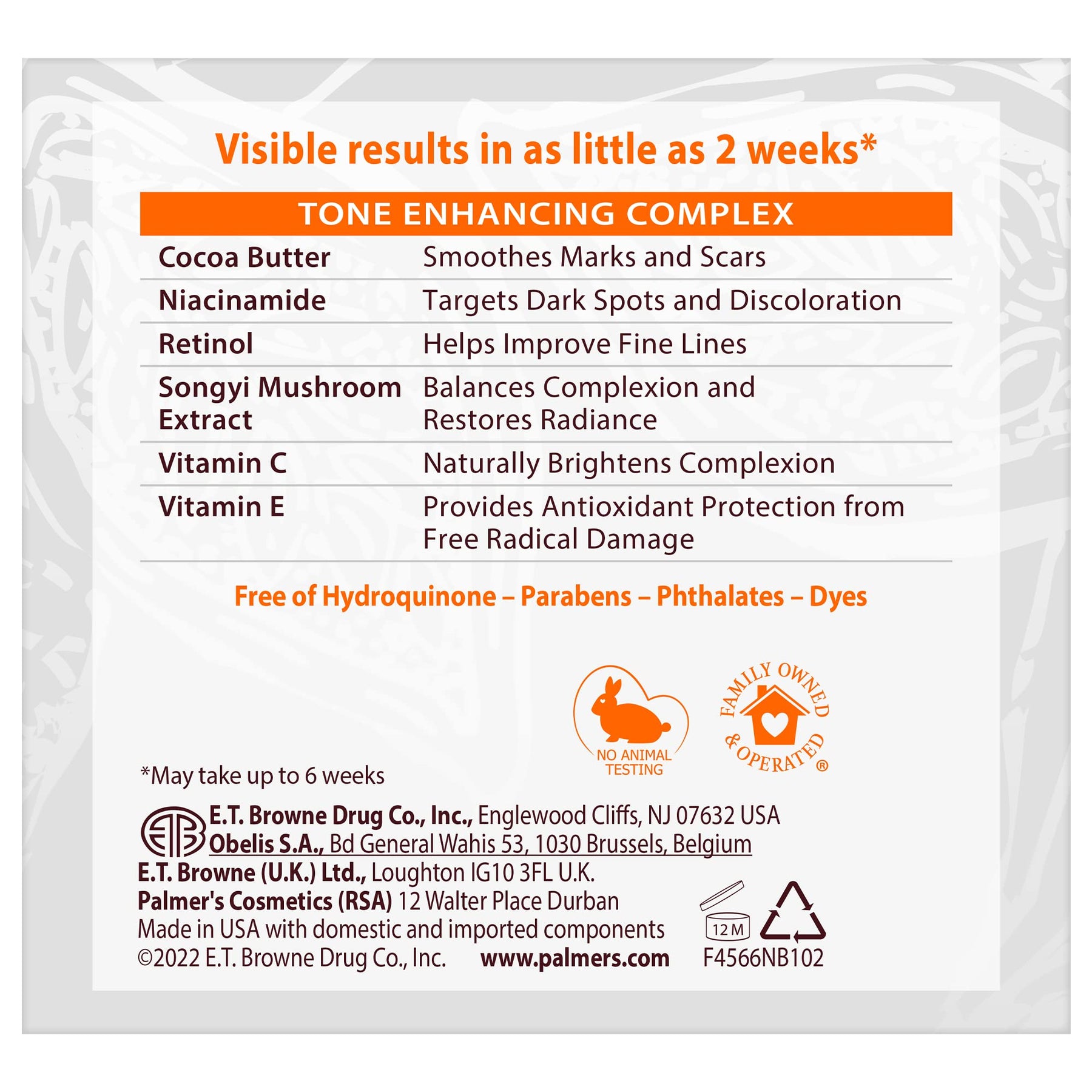 Details: Battling skin discoloration? When you're dealing with dark spots, diminishing them may not happen overnight, but consistency is key. Applying a fade cream when you start your day, or before you climb into bed, could be an asset to your facial skin care routine. Palmer's Cocoa Butter Formula Eventone Fade Cream visibly targets unwanted discoloration, dark spots or age spots caused by sun damage, aging skin or scarring. Free of Hydroquinone, Parabens, Phthalates, Fragrance Sulfates, MI and Dyes, this fade cream for dark spots is made with 5% Niacinamide to leave your skin brighter and more radiant looking.