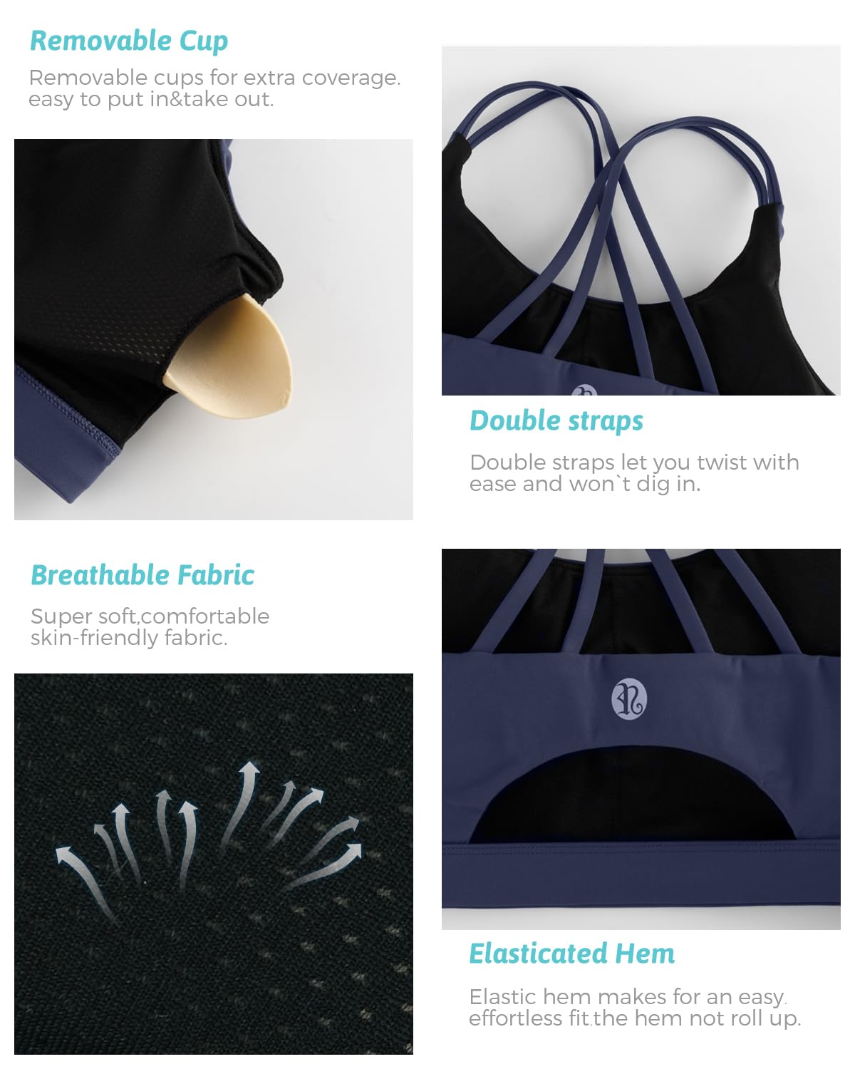 - √YOUR SECURE FIT - Strappy design meets sporty style. Super soft scoop neckline with light, removable pads. Open cutout back styling sports bras for women medium support, widen band underneath the breast ensures a tight secure fit. Removable cups for extra coverage. The removable vertical cotton bra pads are easy to clean.The padded sports bra which always retains its shape and prevent bra bulges, caresses your figure to adjust to your curves.