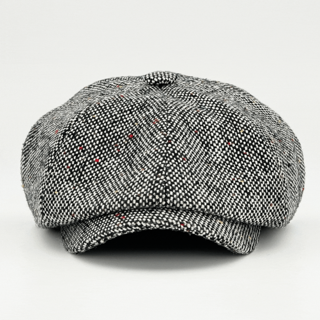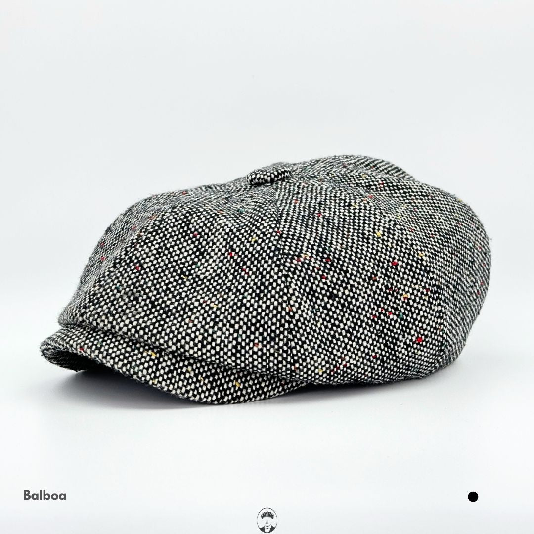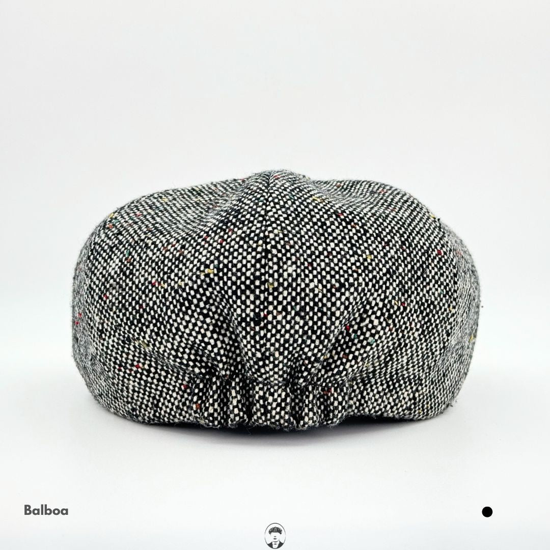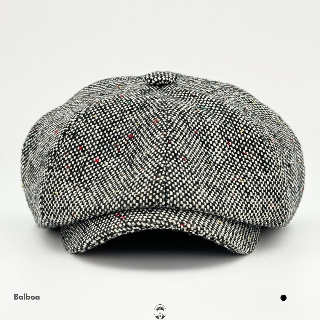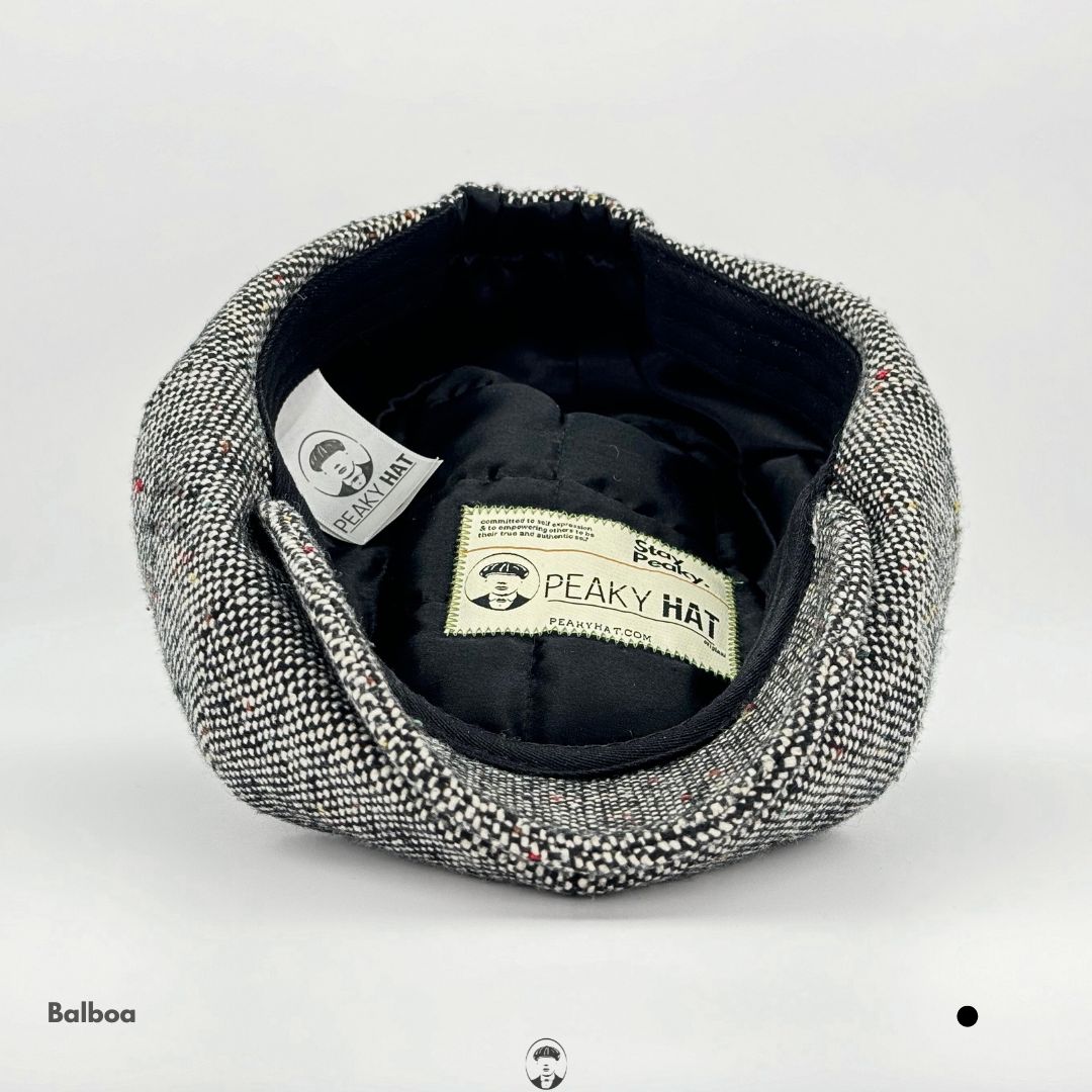 The Peaky Balboa. Inspired by the iconic cap worn by Rocky Balboa in Rocky IV, this hat delivers a punch. Made from the same fabric, sporting the subtle colored speck pattern that is buried into the fine black and white checker. Lined interior with a small amount of elastic to ensure comfort and support long hours of wear. Tell the world.
