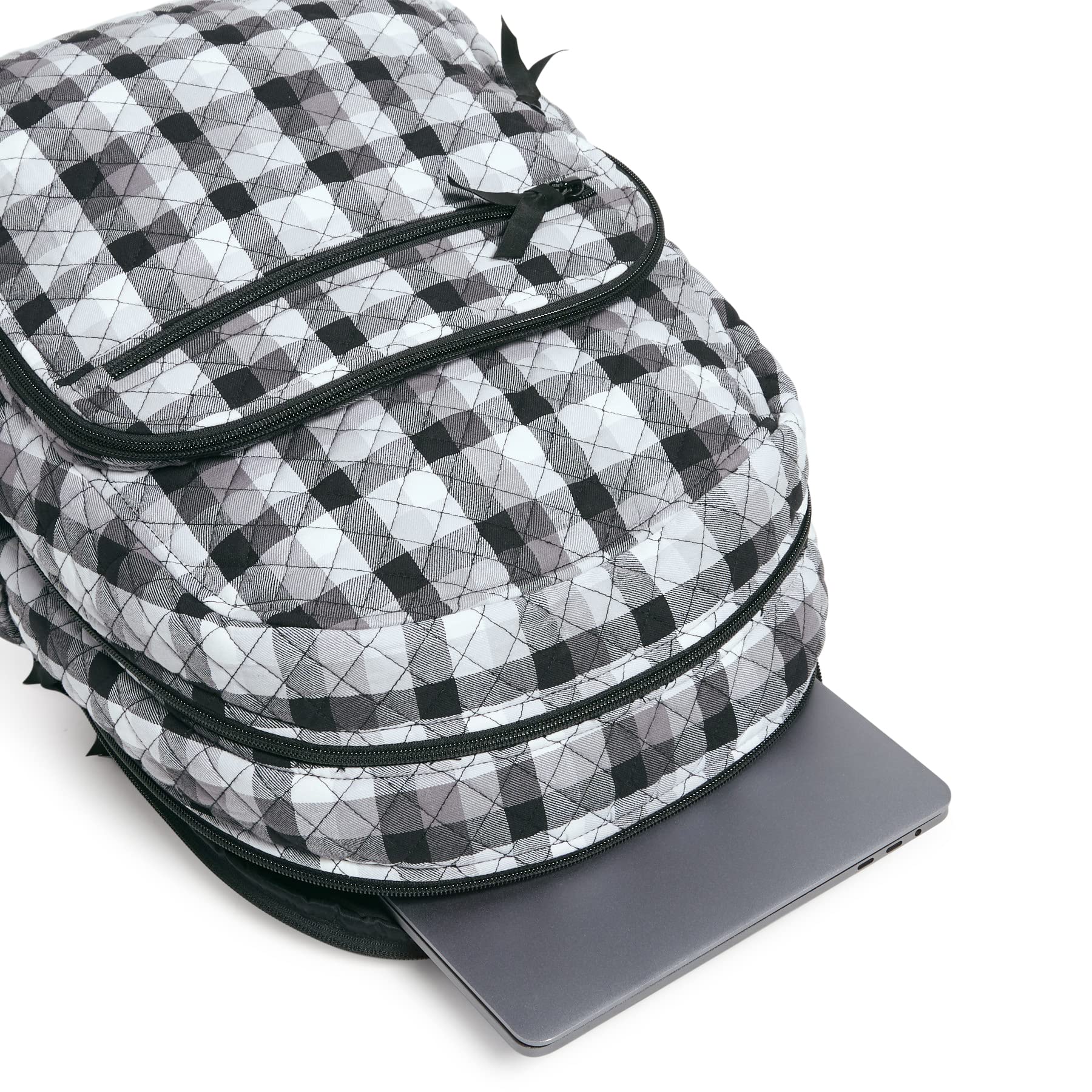 Details: Vera Bradley is your back to campus destination! Our back packs are perfect for class, campus, work, and travel, including backpacks for men, backpacks for women, and backpacks for college. Our bookbags have plenty of organization, whether you are shopping for a large backpack or a mini backpack.Consciously crafted with recycled cotton. Exterior features two side slip pockets, a u-shaped front zip compartment with a front zip pocket and a hidden back zip pocket. Front u-shaped zip compartment contains four slip pockets, three pen slips and an ID window. Main compartment features two mesh slip pockets. Padded laptop compartment. Padded shoulder straps are shaped for optimum comfort on body. Back panel is padded, and features a shaped trolley sleeve. Zip closures. Accommodates up to a 15' laptop.Machine wash cold, gentle cycle, only non-chlorine bleach when needed; line dry