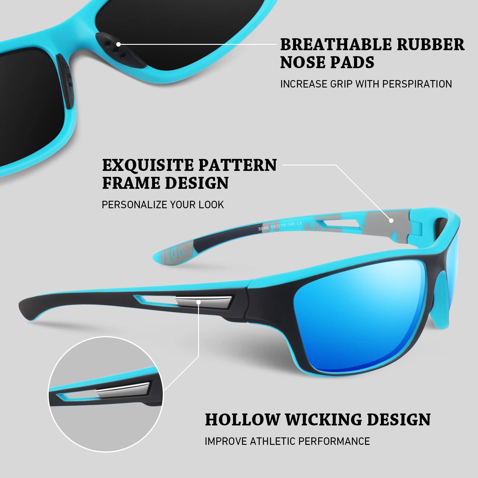 • 🚮‍HIGH PERFORMANCE FRAMEâ–șWEAROYO wraparound sport sunglasses feature a lightweight frame which is shock-resistant, lightweight, and non-allergenic.For extended comfort during long periods of use.WEAROYO frames are built to survive years of active use, they are ultra-lightweight, extremely flexible, resistant to heat, resistant to UV rays, and possess excellent memory and retain their shape.