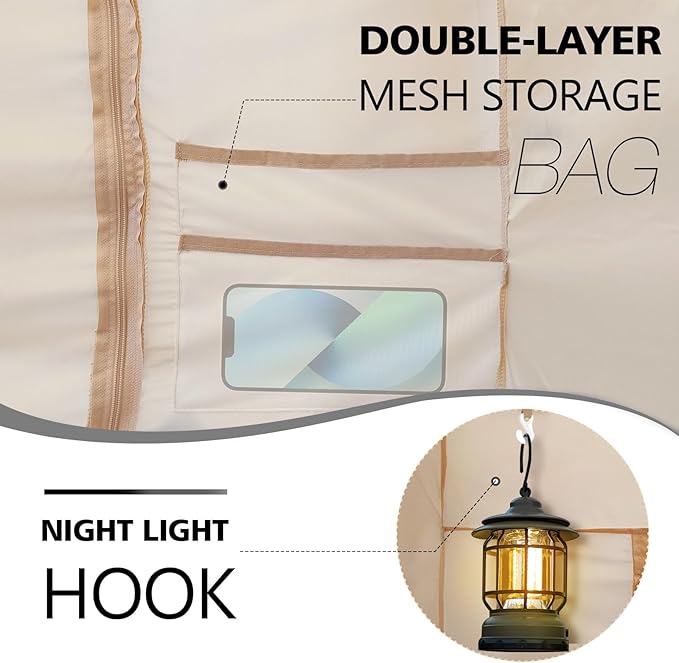- Multi-purpose - 3 big doors with two layers of fabric, one is mesh to prevent mosquitoes from entering, one is blackout 80% fabric. You can't see inside from the outside, so you can change clothes inside. a double mesh storage pocket inside the bed tent, 1 charging cable opening and 1 night light hook, when you turn on the light, the inside of the tent will create a dreamy atmosphere