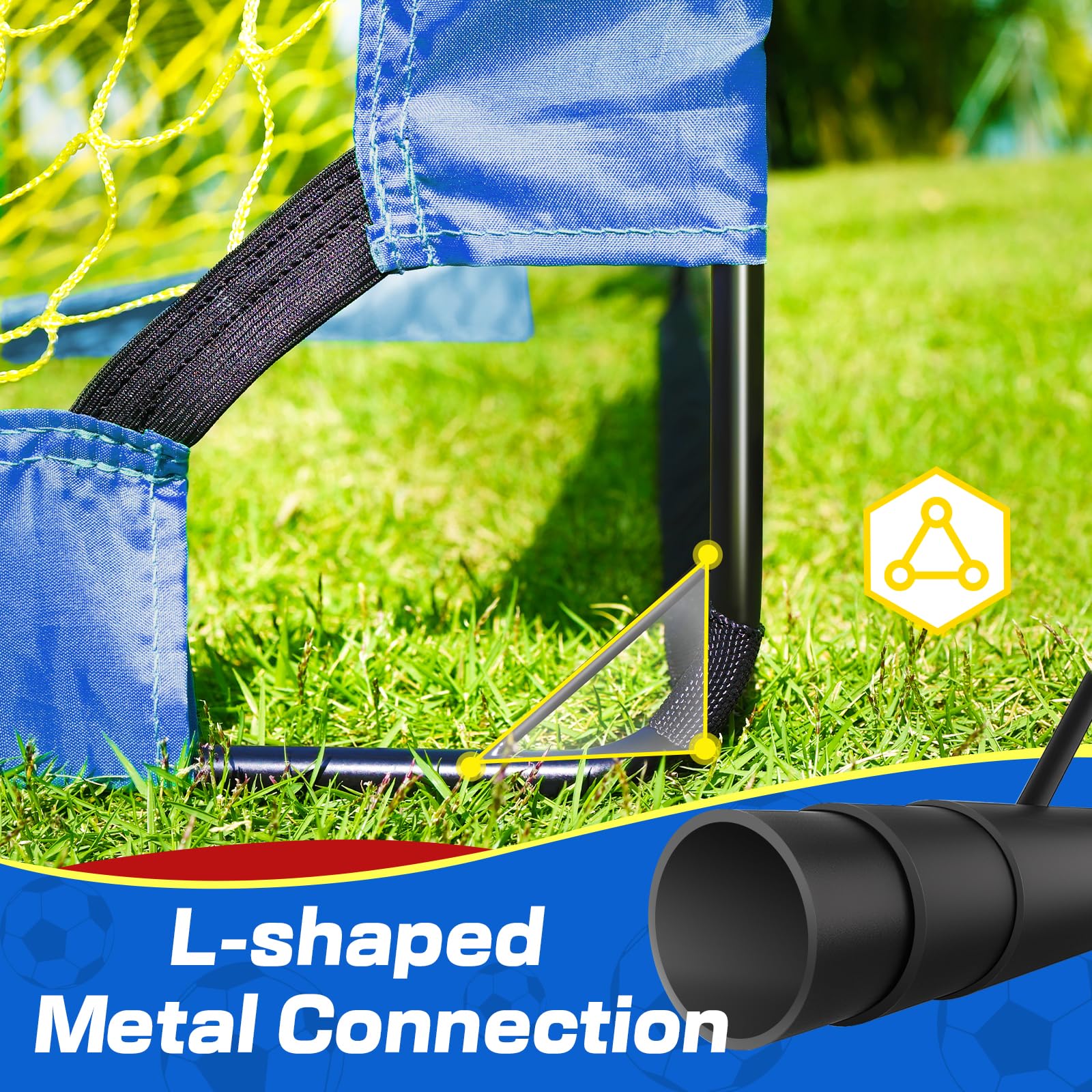 - WITHSTAND TEST OF TIME: Backyard soccer goal equipped with sturdy steel corners and multi-layer reinforcement, come with 4 ground stakes and 4 elastic cords to further enhance the stability during use. Resilient fiberglass pole exhibit exceptional strength and durability, enabling it to withstand long-term use and external impacts. 400D All-weather Oxford fabric, reinforced with double-layer stitching, make that edges of the goal won't wear out. Kids soccer goal can be used for up to 10 years