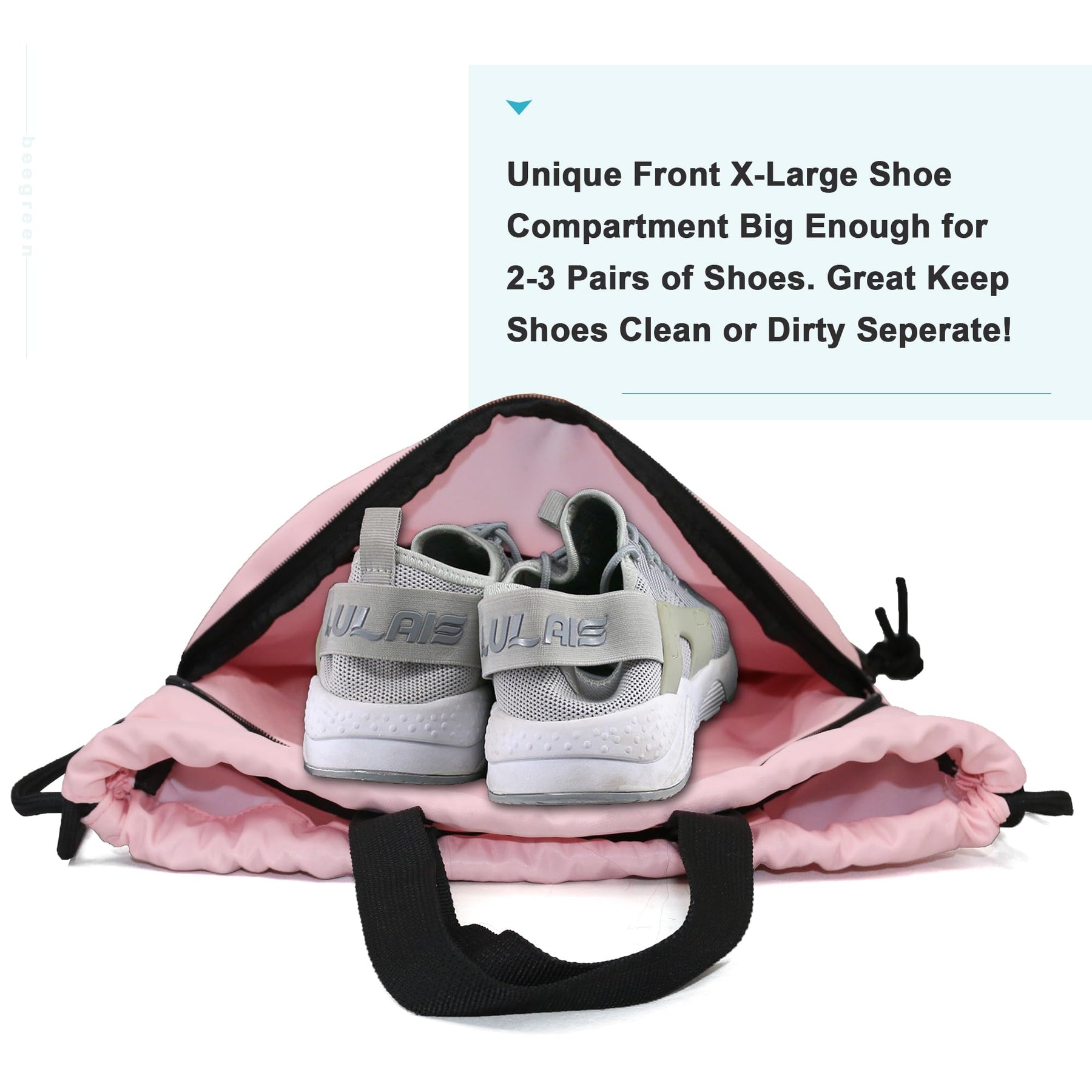 • GOOD WORKMANSHIP: These workout bags for gym women are double stitches for all seams, metal eyelets for reinforced corners. Thick strong string cords, reinforce high density PP webbing, custom zipper for long time use.