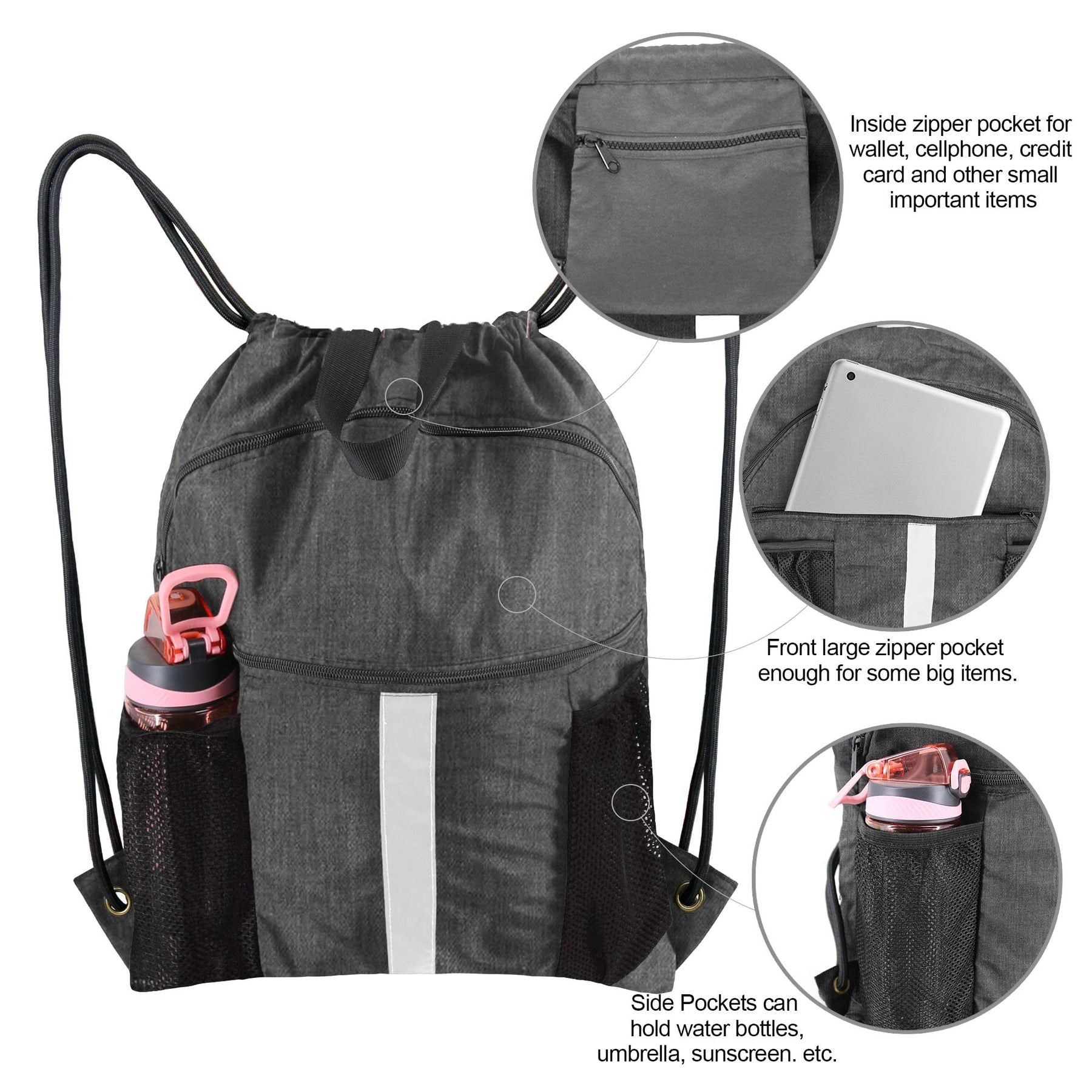 Details: Convenient Multi Pockets: The big shoe compartment in front of gym drawstring backpack can hold two pairs of shoes; the smaller zipper front pocket is perfect for keeping an ipad, towel, and other items, the bigger one is an ideal place for shoes. Besides, two sides mesh bags allow you to place a water bottle, umbrella or sunglasses easily. Inside of gym sack bag drawstring backpack sport bag, the zipper pocket can hold small valuables such as wallet, cellphone, keys and so on. Multiple Pockets help you to keep things to be placed by category, easy to be found.