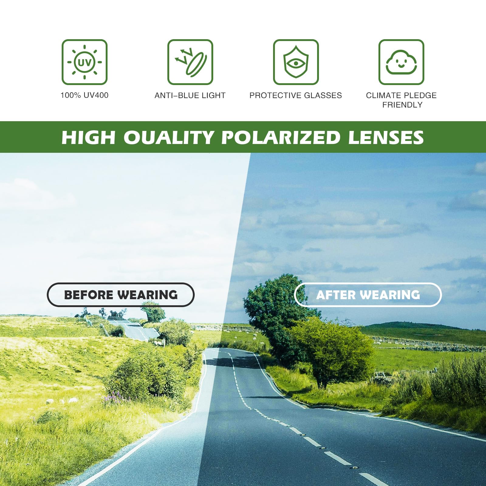 - 【HD Polarized Lens】HD polarized lenses are engineered to enhance visual clarity and definition by reducing glare and distortion caused by reflections from surfaces like water, snow, and roads. This technology helps to improve contrast and color perception, resulting in sharper and more vivid images.