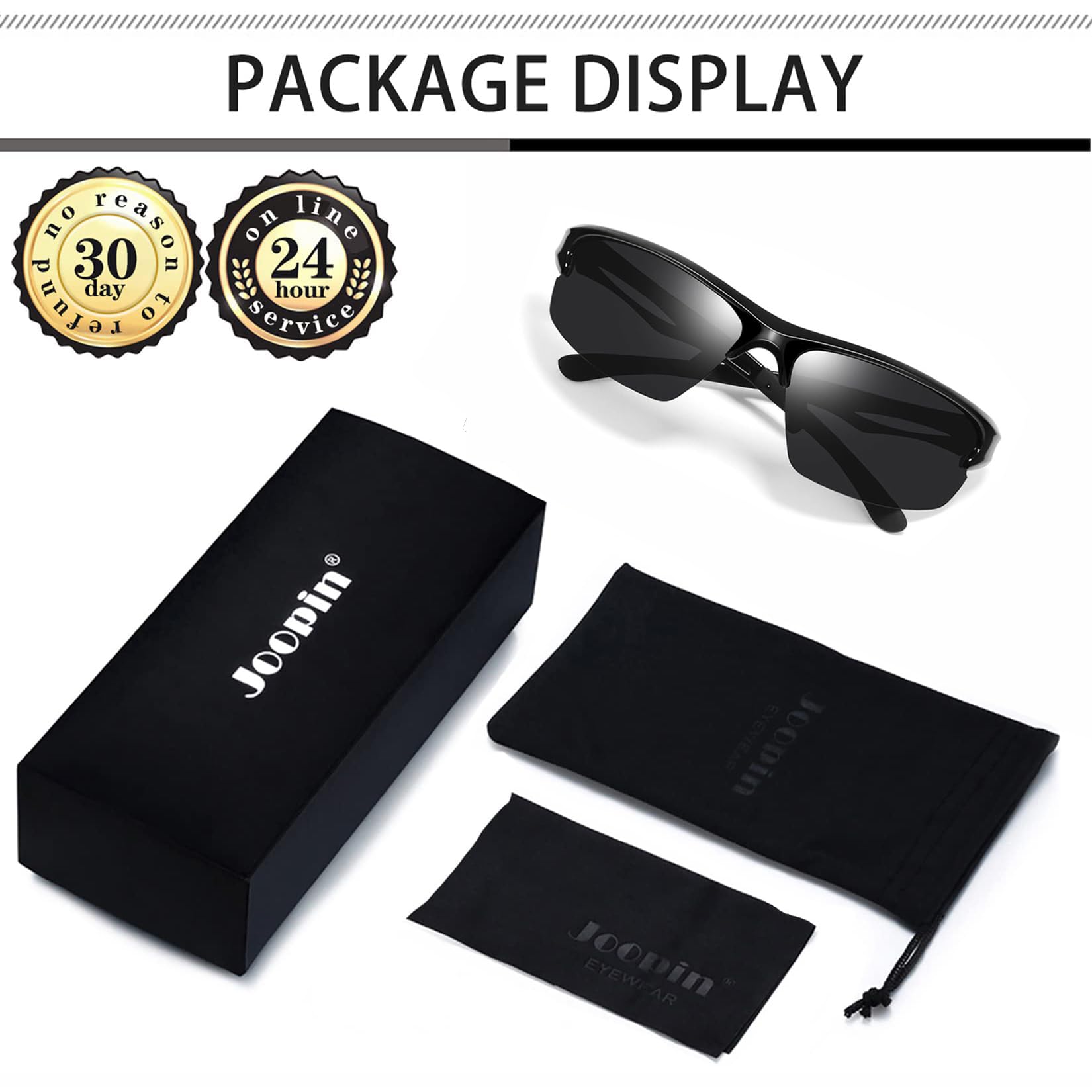 - PACKAGE INCLUDES: Shiny black sports glasses x 1 / soft box x 1 / exquisite bag x 1 / lens cloth x 1. Joopin sunglasses are made of polarized lenses, high-quality plastic frames, TR90 temple tips, lightweight, all the details will bring you an comfortable wearing experience. Joopin focuses on fashion men sunglasses and women sunglasses. Click and get your fashion and cheap sunglasses now