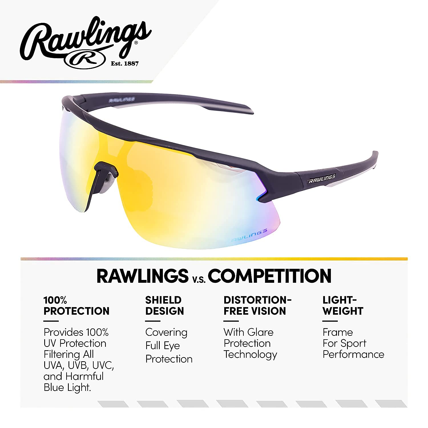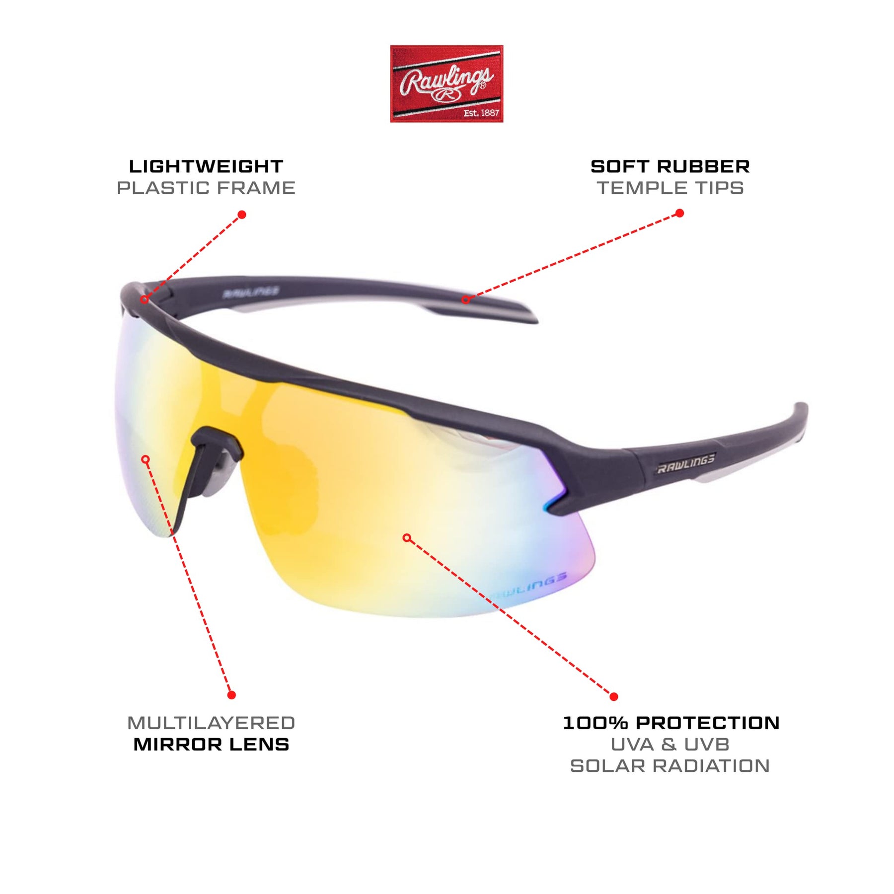 Details: RAWLINGS QUALITY - #1 SPORT SUNGLASSES FOR YOUTH ATHLETES:Rawling, the leading name in Sporting Goods since 1887, has driven innovation in all aspects of high-performance equipment and protective gear for professional, amateur, and entry-level athletes. Rawlings is the Official Baseball Supplier, and Official Helmet of Major League Baseball , the official baseball of Minor League Baseball, the official baseball and softball for the NCAA , and the approved baseball, basketball, football, and softball of the National High School Federation .