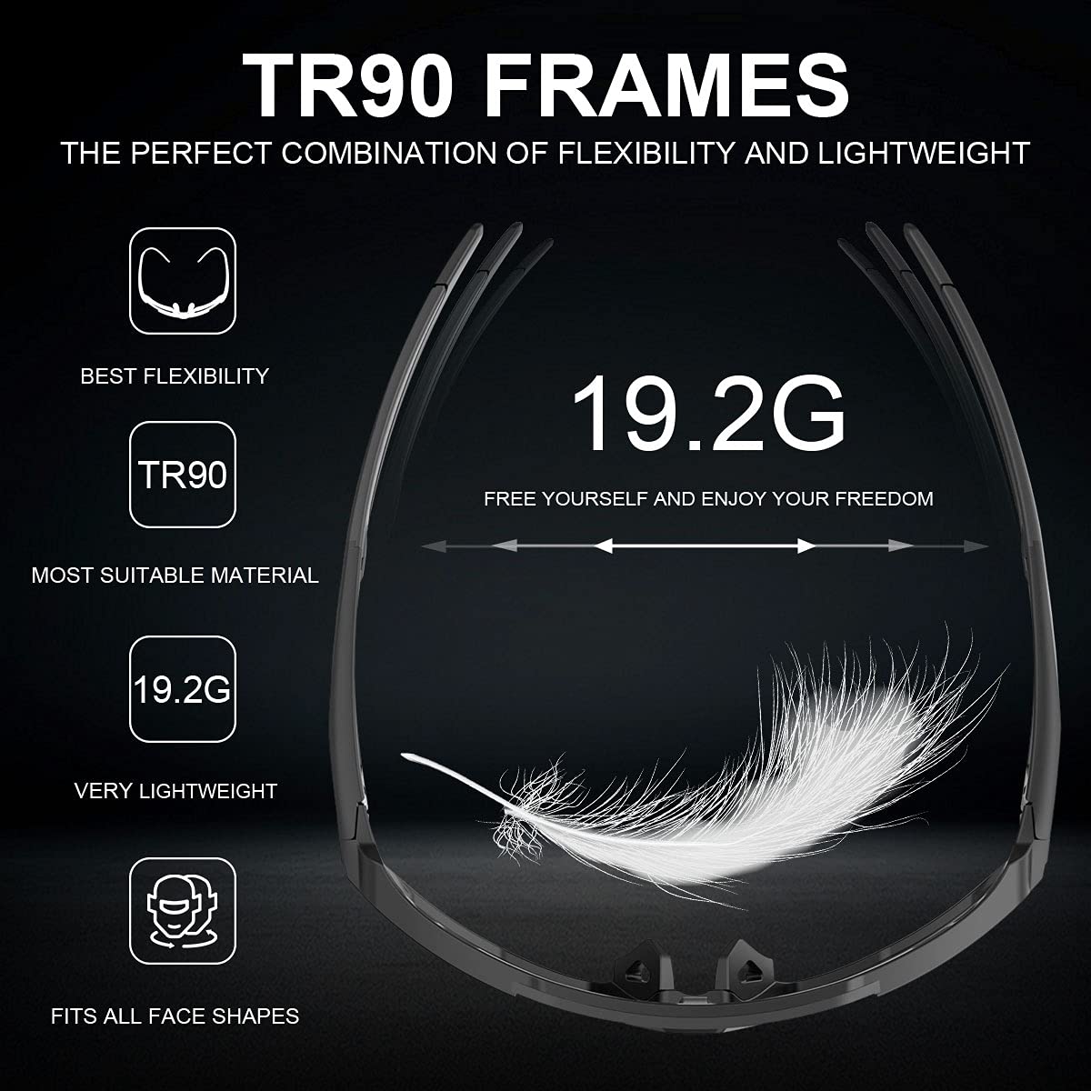 - Stress Resistant TR90 Frames:An active lifestyle means that your sunglasses will have to be tough and rugged enough to meet up to whatever challenges you throw at it. The specially designed Stress Resistant TR90 Frame can meet up whatever you dish out to it and more.