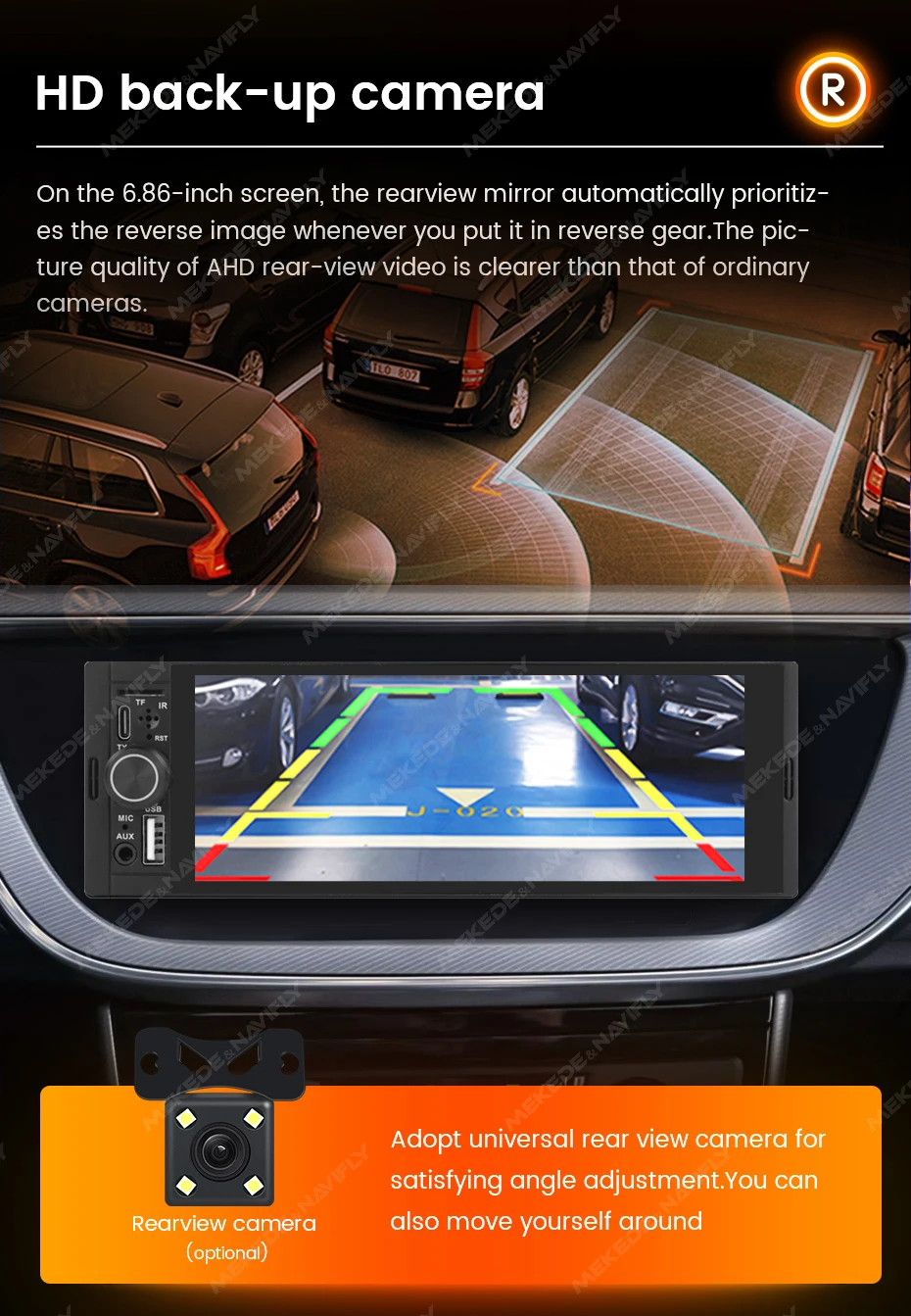 Support HD back-up camera: on the 6.86-inch screen, the rearview mirror automatically prioritiz-es the reverse image whenever you put it in reverse gear.The pic-ture quality of AHD rear-view video is clearer than that of ordinary cameras.