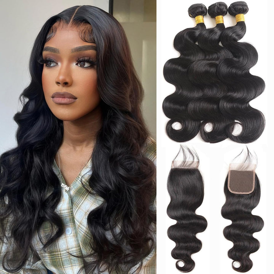 Releek Body Wave Bundles With Closure Brazilian Human Hair 3 Bundles With Closure(10 12 14+10) Inch Body Wave 100% Unprocessed V