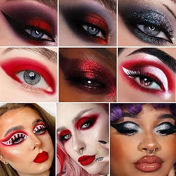 - 🩸【GOTHIC CLOW HALLOWEEN MAKEUP PALETTE SUIT FOR ALL OCCASIONS】 —— Professional Halloween makeup kit blood red black powder goth eyeshadow palette. Perfect for Day of the dead, carnivals, festivals, campfire or theme parties, SFX makeup,stage performances. Easily create crown, Joker, costume, skeleton blood red Devil cosplay looks. Goths, clowns, mimes, superhero designs, Halloween costume theme, killers creating zombie, vampire monsters and other gory scene makeup,Christmas candy cane makeup...