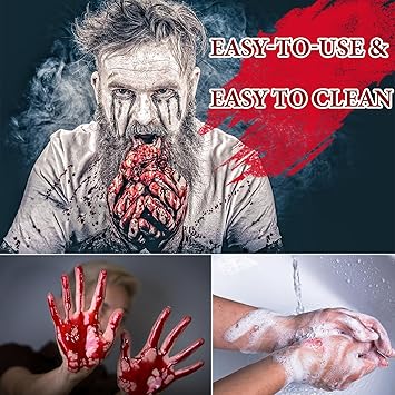 - 【Ingredients】Fake bood washable is made of pure water, honey and other ingredients, friendly and gentle to the skin, can be applied directly to the skin, so as to create a realistic and scary fake wounds, fake blood tears, bloody bleeding and other special effects.