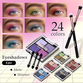 • [Great Makeup Kit] The full face makeup set is tailored for girls and beginners. It contains: 6 x 9 colors Eyeshadow palette, 1 x 2 colors Blusher Palette, 1 x Highlighter & Contouring Palette, 1 x 4 colors eyebrow powder palette, 2 x liquid lipsticks, 1 x mascara, 1 x lip liner, 1 x eyeliner, 1 x fashionable cosmetic case, 1 x double-ended eyebrow brush, 3 x double-ended eyeshadow brushes, 1 x blusher brush, 1 x pencil sharpener, 2 x eyeshadow brushes