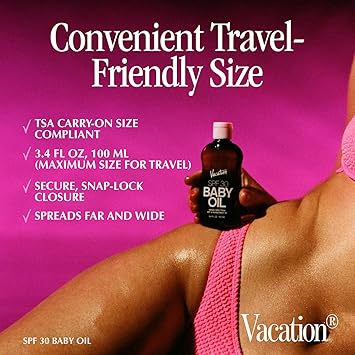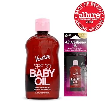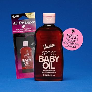 Vacation Baby Oil SPF 30 & Air Freshener Bundle, Hydrating Nourishing, Mineral-Oil Free, Lightweight Formula, Transparent On All Skin Tones, Travel Size Sunscreen, 3.4 Fl. Oz.