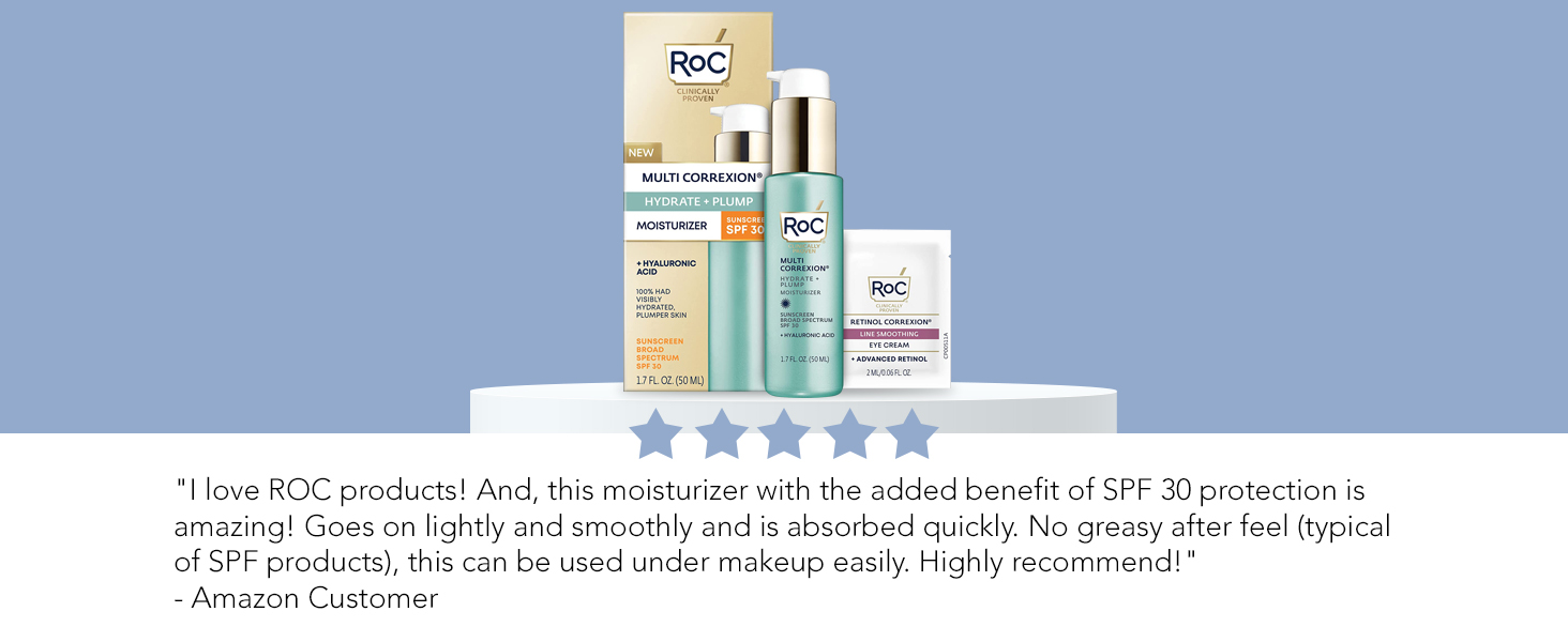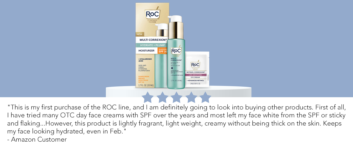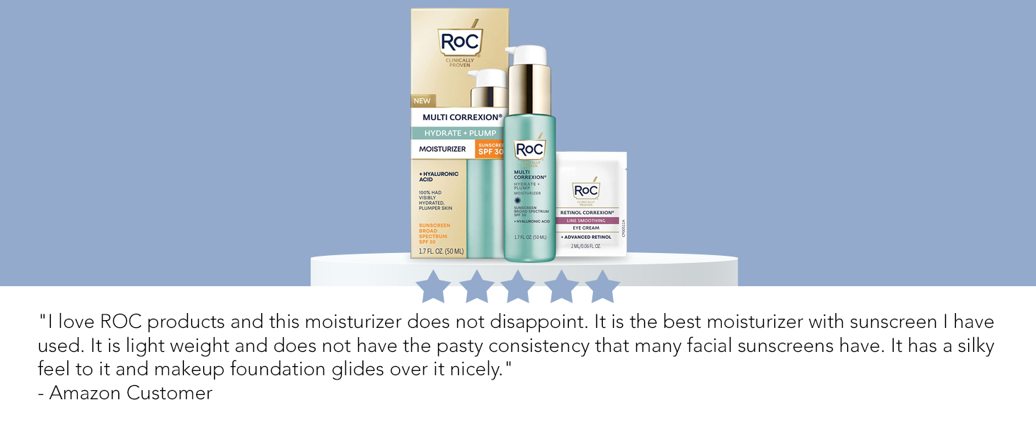 Start your day by deeply hydrating, visibly plumping, and protecting with RoC Multi Correxion Hydrate + Plump Moisturizer SPF30. This clinically proven gel-cream formula uses the power of pure Hyaluronic Acid to quench thirsty, deflated skin to plump away visible lines & wrinkles while providing UVA/B protection. This breakthrough formula is invisible on all skin tones.