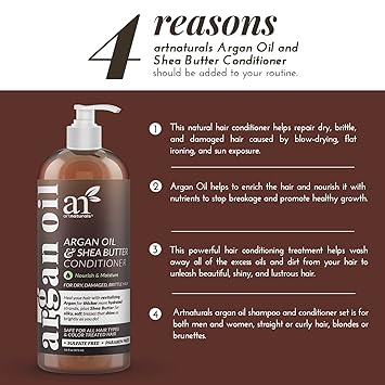 • ARGAN OIL: Moroccan Argan Oil is a natural moisturizer that keeps hair hydrated. The hair conditioner helps repair dry, brittle, and damaged hair caused by blow-drying, flat ironing, and sun exposure