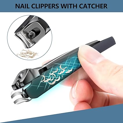 - Ergonomic Angled Nail Clippers: Feature a bionic 7-shaped angled head, the nail clipper with catcher allow clear visibility of the blade and nails for precise, comfortable trimming without bending or twisting—ideal for seniors, adults, and anyone with limited mobility. With 5 times wider jaw opening, the long handle nail clippers can easily cut through thick, hard toenails. The 3.8-inch long handle offers added leverage, reducing effort and preventing slipping with its non-slip texture.