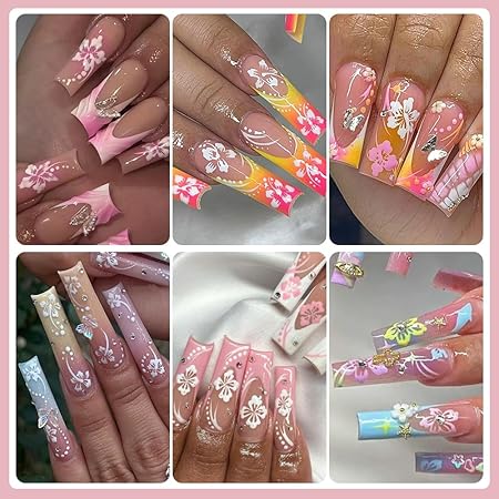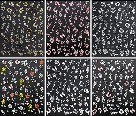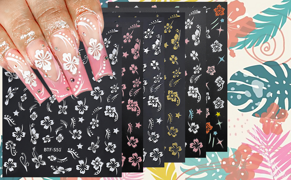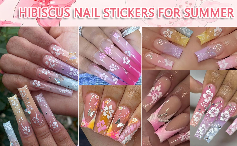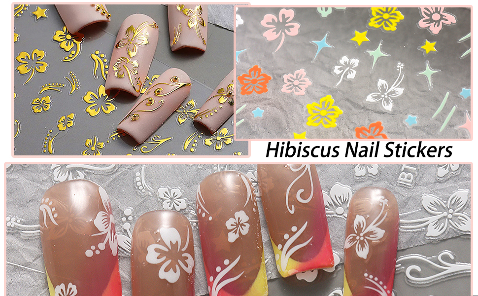 Flower Nail Stickers, Hibiscus Decals 3D Self-Adhesive White Pink Gold Pattern Summer Design Manicure Tropical Accessories for Women Girls(6Sheets), FHJKMG01