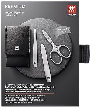 If you don't want to be without premium nail-care instruments when travelling, then you need the 3-piece pocket case from the TWINOX® manicure range. It contains three instruments ideal for nail and other care needs. The combination nail scissors effortlessly trim finger and toe nails, with the sapphire nail file providing the final finish. The set also includes tweezers. All the instruments are made of rust-free stainless steel. The pocket case will impress not only with its contents but also with its elegant, black nappa leather exterior. The material is also extremely robust to cope with long-term, frequent use. With ZWILLING's pocket case, you are best equipped for your daily nail-care needs.