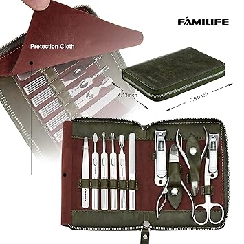 FAMILIFE Manicure Set, Nail Kit 11 in 1 pedicure kit Stainless Steel Mens Leather and Gift Set for Women Men Pedicure Care Tools