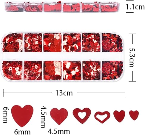 Quantity: 12 Grids/Set.Heart Nail Glitter Fakes