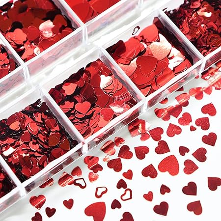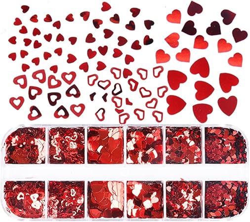 Heart Nail Art Glitters for Valentine Day Charms Decorations Love Sequins Flakes,Holographic Red Stickers Acrylic Nails Supplies Manicure Accessories 12 Grids