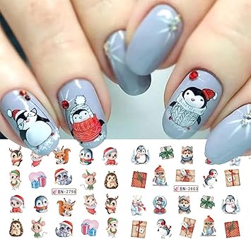 Cute Christmas Nail Stickers Cartoon Animal Water Transfer Decals Snowman Elk Penguin Bear Design Sticker Accessories for Women Girls Manicure Decoration 12 Sheets