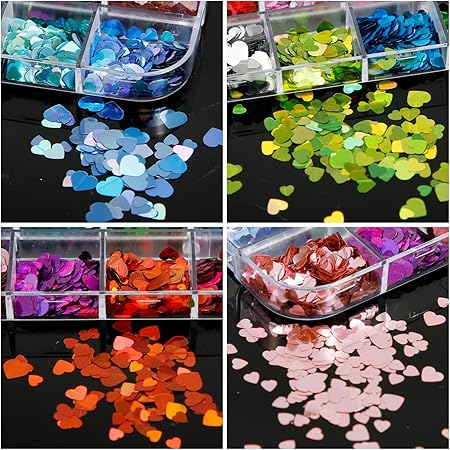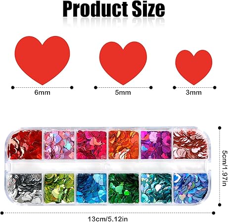 12 Colors Heart Glitter Nail Sequins, Valentines Stickers Confetti Charms Designs Love Flakes Decals for Manicure Makeup DIY Decorations (3 Sizes)