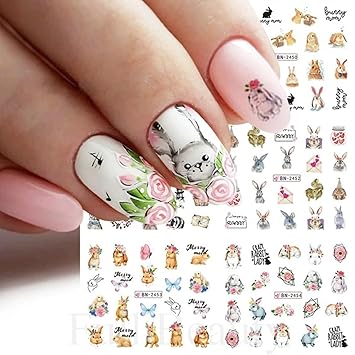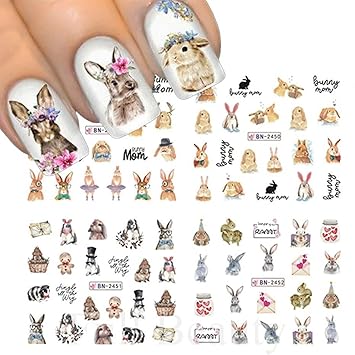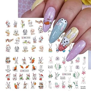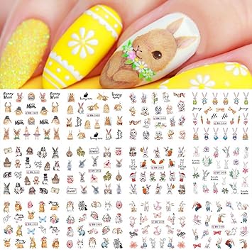 12 Sheet Bunny Nail Art Sticker Decals Easter Water Transfer Stickers Cute Rabbit Flower Carrot Design for Women Kids DIY Decoration Acrylic Nails Supplies