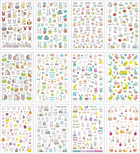 12 Sheets Easter Nail Art Stickers Decals Bunny Self-Adhesive Egg Supplies for DIY Decoration 3D Adhesive Accessories Women Designs