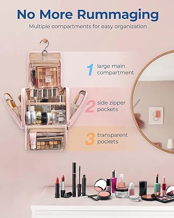 • 【Easy to Use】: With 3 transparent pockets, this hanging makeup bag organizer makes it effortless to keep your essentials organized. The left side pocket features a stain-resistant PVC lining, which is tailored to store makeup brushes, powder puffs, sponges, and other items that require special consideration. The top and bottom transparent pockets provide additional storage space while ensuring easy accessibility to small items.