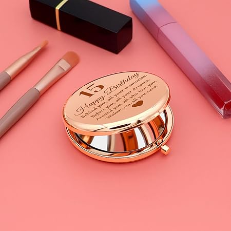 - Happy 15th Birthday Gift Portable Compact Makeup Mirror - This Folding Mirror is designed to be easily carried around. Mini size 2.6 inch/65mm , This folding mirror is light weight and very compact, perfect for multi-purses and travel. Easily fits into your pocket, purse, handbag, cosmetic bag so that you can makeup anytime, anywhere.