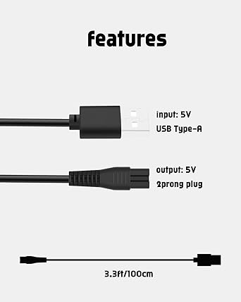 • 【Features】 Input: AC 5V USB Type-A; Output: DC 5V 1A 5W(max) 2 Prong Plug(NOT USB Type-C); Power cord length: 3.3ft/1m. Bend lifespan of more than 6000 times. with 1 cleaning brushes