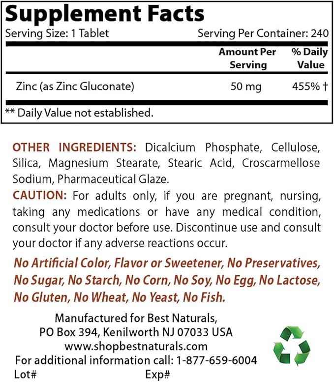 Best Naturals Zinc Supplement as Zinc Gluconate 50mg 240 Tablets Pack of 2