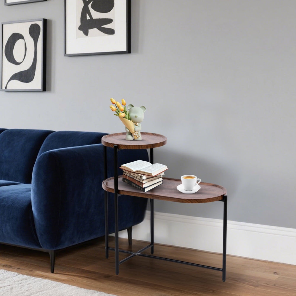 SHIBAILI Small Space 2-Tier Round Sofa Table - Brown Wood Top,Metal Frame