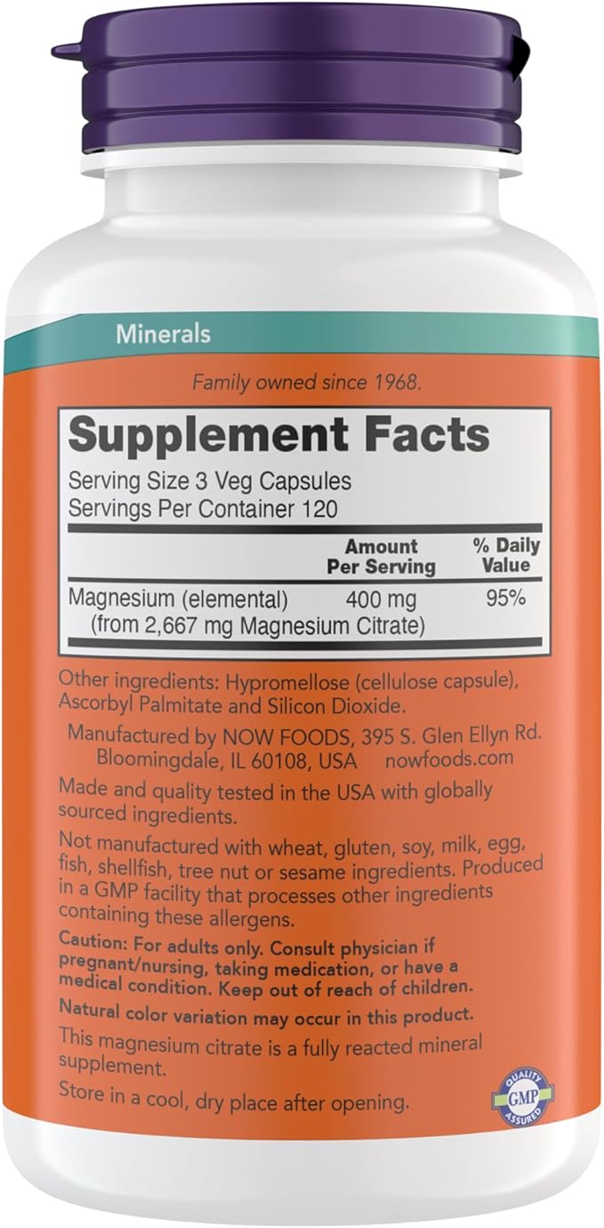 NOW Supplements, Magnesium Citrate, Enzyme Function*, Nervous System Support*, 60 Veg Capsules