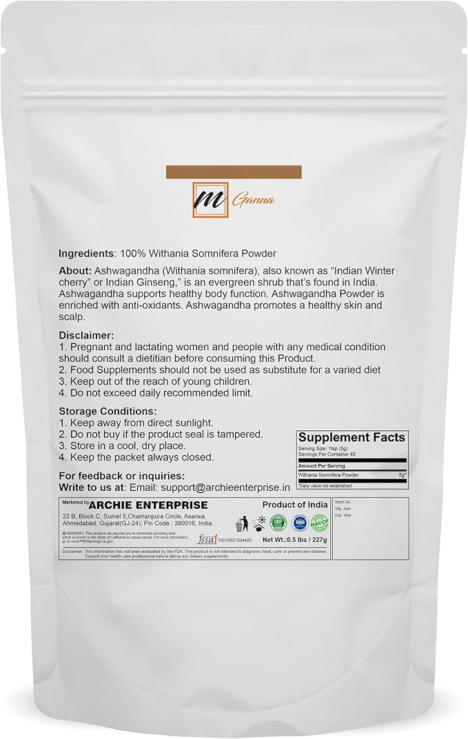 mGanna 100% Natural Ashwagandha/Withania Somnifera Powder 227 GMS / 0.5 LBS for Health Care