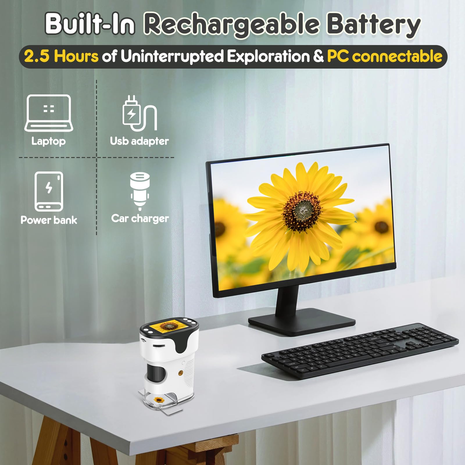 - Our digital microscope comes with a built-in large capacity rechargeable battery, allowing for 2.5 hours of continuous use once fully charged. It includes a charging cable, ensuring everything you need is in the box—no additional purchases necessary for immediate exploration.