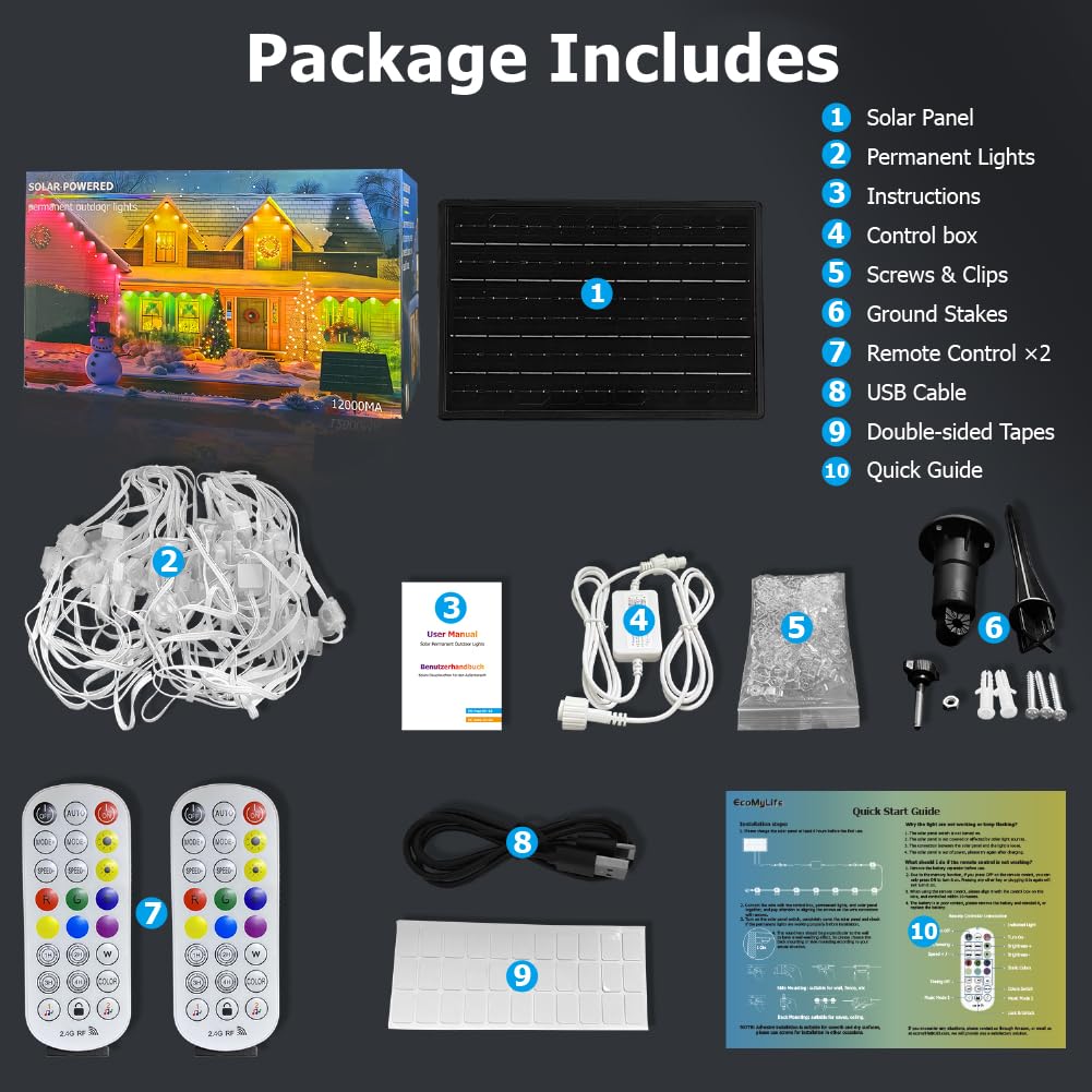 - 【Smart RGB+IC Lighting】 Each lamp bead has a built-in IC to achieve 16 million colors and DIY functions. EcoMyLife Christmas lights create a visual feast for every festival, offer endless possibilities for decorating your yard, garden, patio, living room and bedroom, suitable for various occasions such as Christmas, Easter, Halloween, Valentine's Day and daily use. Our multi-functional luminaires are not only available in colourful decorations for the holidays, but also meet the needs of daily white lighting use. Whether you're having a family gathering, spending time with friends, or just looking for a moment of tranquility on your own, our lighting can make every moment better.