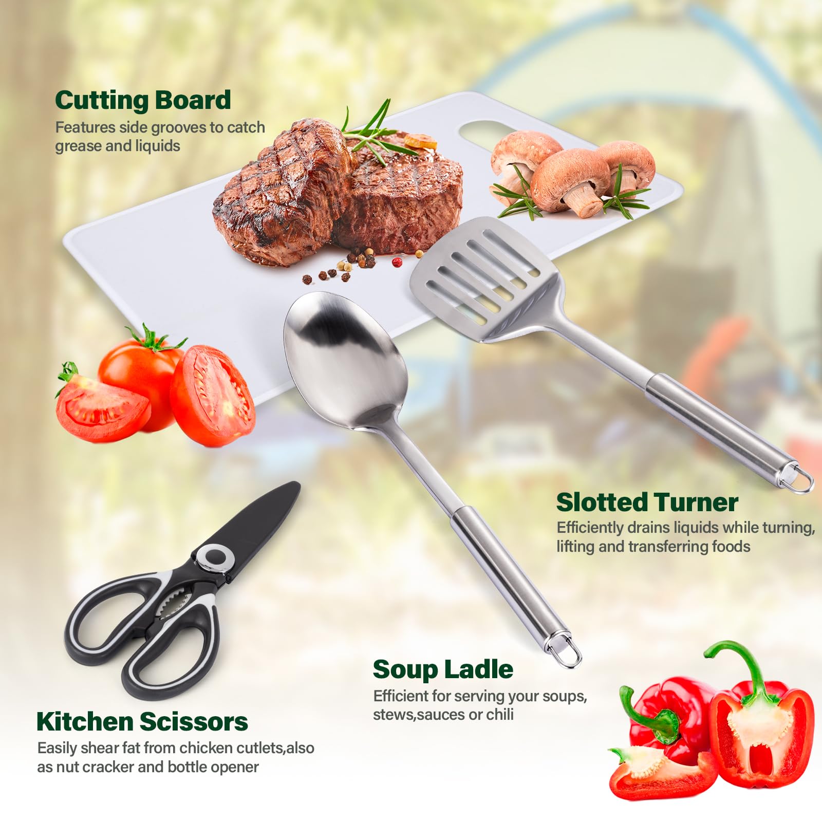 - 【What's in Backpacking】 10 PCS Camping Cooking Utensils Set provides easy access to all your grilling accessories and camping kitchen utensils while you are on the move.Included: Cutting Board*1,Soup Ladle*1,Slotted Turner*1,Barbecue Fork*1,Folder*1,Wine Opener*1,Kitchen Knife*1,Paring Knife*1,Kitchen Scissors*1,Can Opener*1.You can also personalize your Camping accessories with other camp cooking gear.