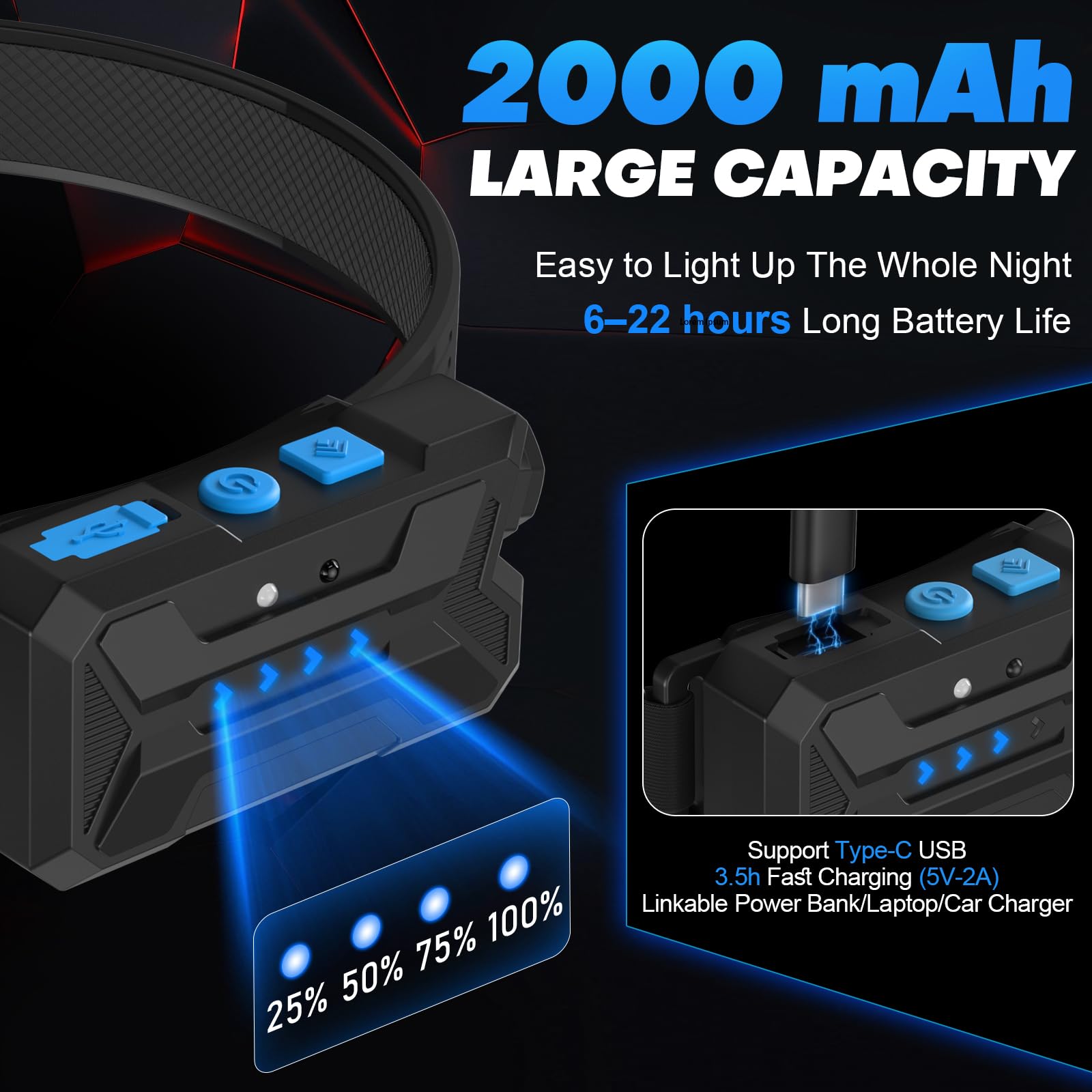- 【Long-lasting & Rechargeable & Power Dispaly】Built-in 2000mAh rechargeable battery to provide a longer service life. When 3.5h fully charged, the head torch rechargeable can run for up to 12 hours under low spotlight, up to 6 hours under high floodlights on white brightness, and up to 22 hours on red light, almost all day long! Not only save the cost of replacing batteries but let you no worry that the battery will suddenly run out.